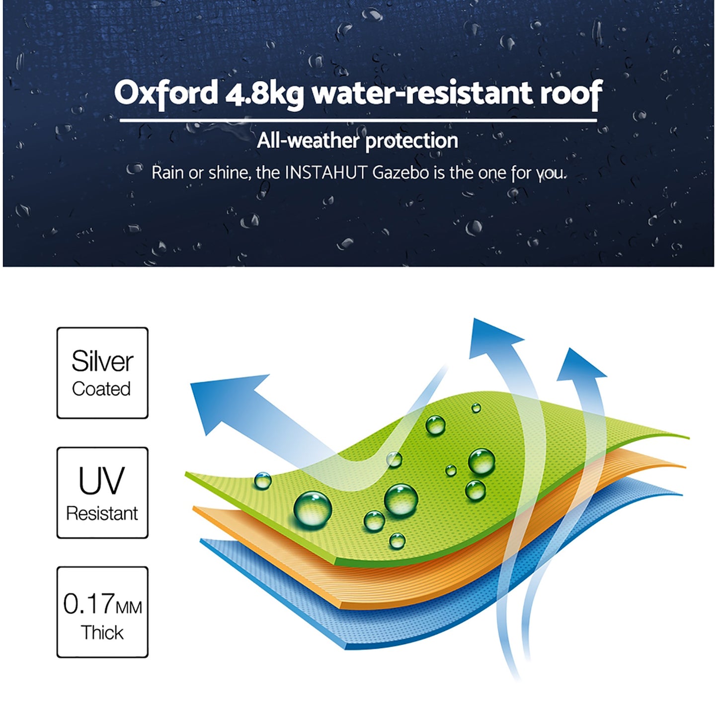With an extra thick and quick-to-erect powder coated steel frame equipped with strong legs and struts structure, the gazebo is very simple to set-up and extremely durable. Fitted with quick and convenient Velcro attachments, easily release/fasten rings, and smoothly glide on nylon insert for effortless set up, the gazebo is designed to make things happen instantly!
