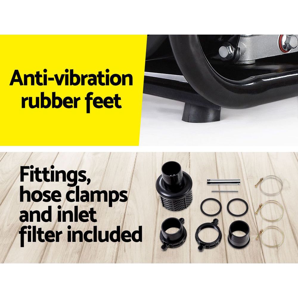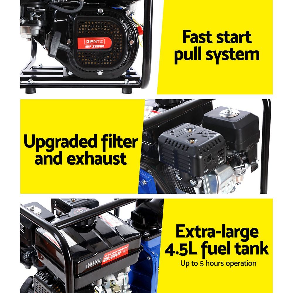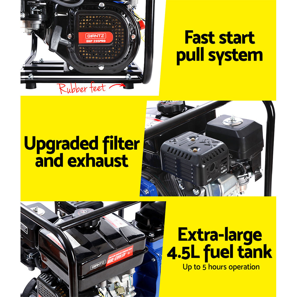 The GIANTZ 8hp Petrol Water Pump provides outstanding performance for general water pumping applications. Whether it is for heavy-duty cleaning, irrigating the garden or pumping out a flooded cellar, you will be amazed with the versatility and performance our monster water pump. Featuring a 80mm (3'') inlet/outlet and a class-leading flow rate of 60,000L/h (1000L/min) , the hardworking water pump is coupled with a powerful 235cc, 3600rpm 4-stroke engine that easily transfers water up to four storeys high with minimum fuss. The motor assembly is housed in an anti-corrosive tubular steel frame.  Better still, ceramic and carbon seals offer great durability and longlasting use. An extra-large 4.5L fuel tank means it can run for up to five hours on a single fill (load dependent). Not least, the water pump now complies with Euro 5 emission standards unlike others that are still on Euro 2. Simply better for you and the environment.