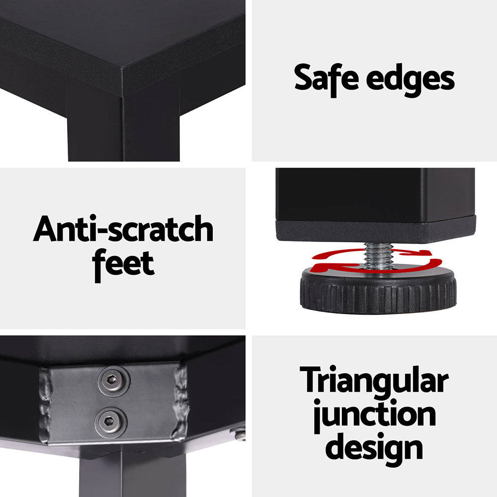 The wide desktop provides ample space for your monitors, keyboards, and all your office essentials. While offering generous surface area, the 15mm thick particle board desktop maintains a sleek profile. The sturdy metal frame ensures stability, while anti-scratch feet protect your floor from damage.