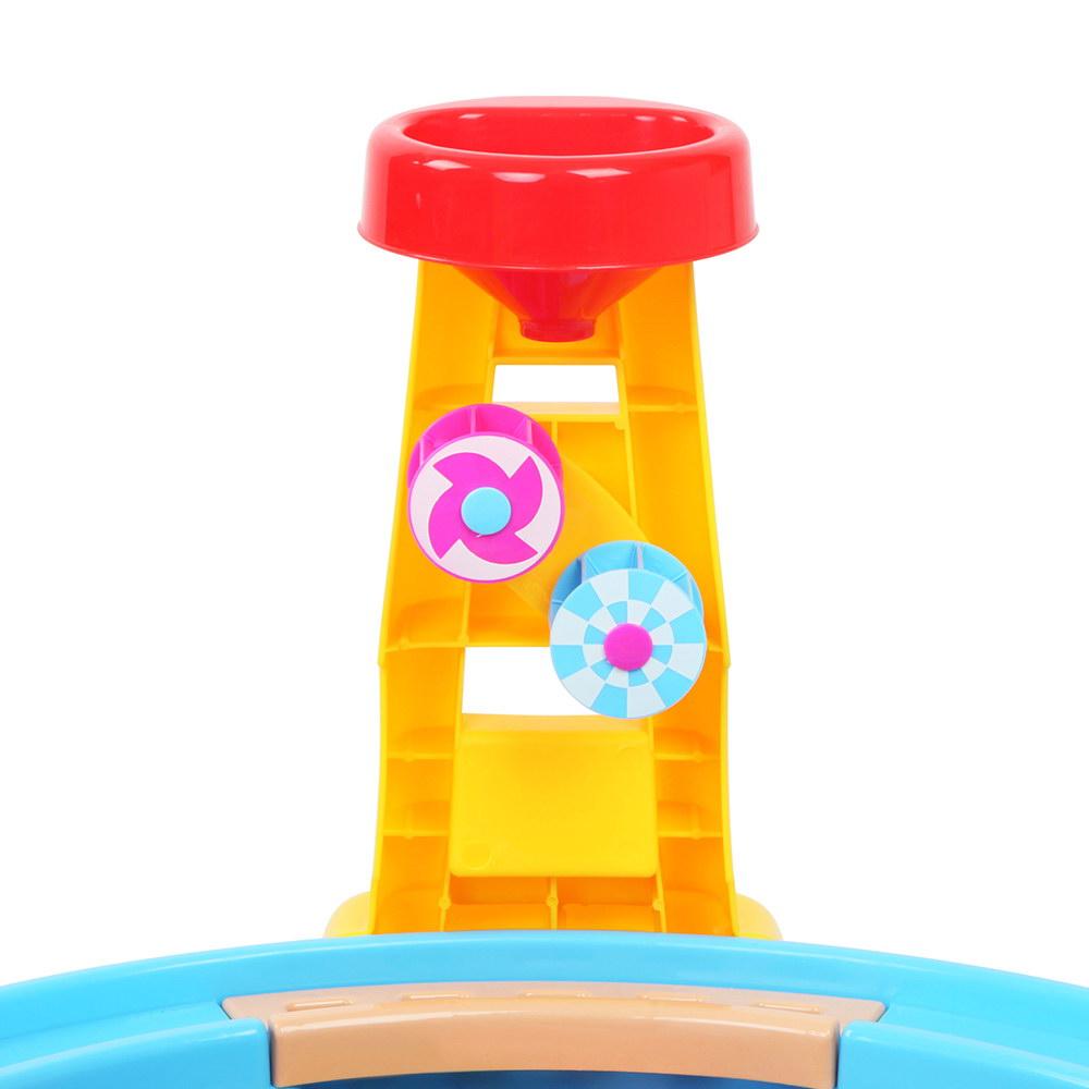 Material: Non-toxic plasticAccessories: 3 Trains, 2 Foor Drain, 3 Funnels, 4 Holders, 2 Boats, 2 Spinner, Spoon, Water Can, Bucket, Paddle Wheel, See-Saw Scoop, Shovel Rake, Umbrella